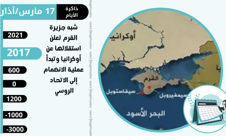 شبه جزيرة القرم تعلن استقلالها عن أوكرانيا وتبدأ عملية الانضمام إلى الاتحاد الروسي في 17 مارس (آذار) 2014