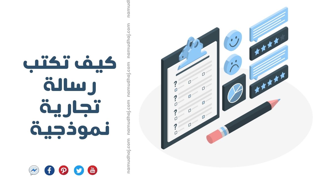 في هذا المقال سوف نتطرق إلى كيفية كتابة نموذج رسالة تجارية مع التركيز على بعض القواعد وتقديم بعض الأمثلة. للرسالة التجارية و حسن تنسيقها أهمية بالغة في مجال الأعمال و التسويق ، لذلك على المحرر أو الكاتب أن يتوخى الدقة المتناهية في صياغتها و العناية بالعبارات و الأسلوب و خاصة المنهجية.