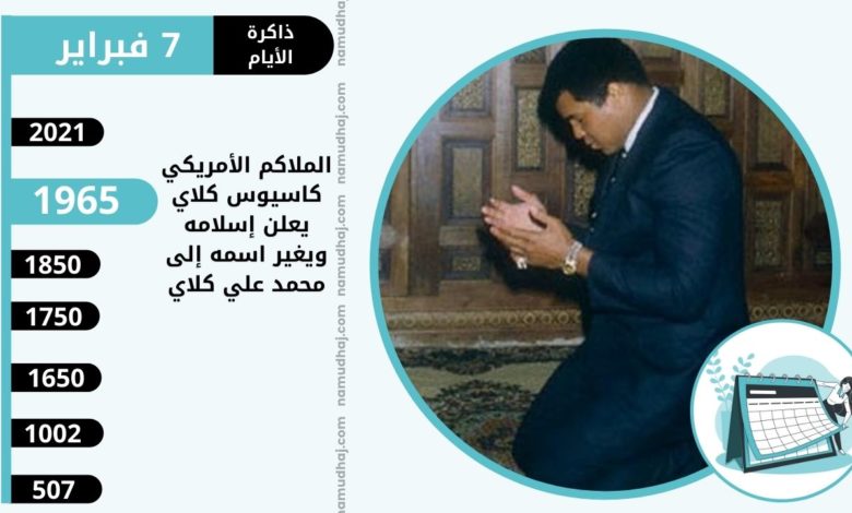 الملاكم الأمريكي كاسيوس كلاي يعلن إسلامه ويغير اسمه إلى محمد علي كلاي في 7 فبراير 1965